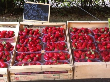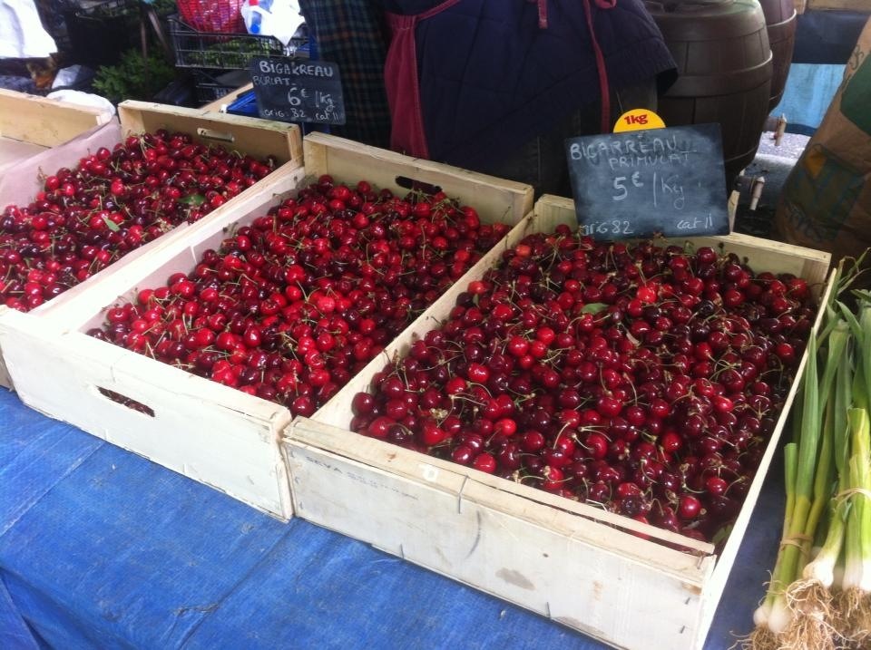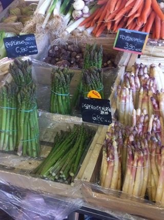 Shopping for dinner at Agen market, completely spoilt by stunning seasonal local produce, four types of asparagus, three local varieties of strawberries, courgettes with flowers attached & first cherries of the season, looks like fois gras with cherries this week ! Turbot day boat caught was to much to resist !!!!!