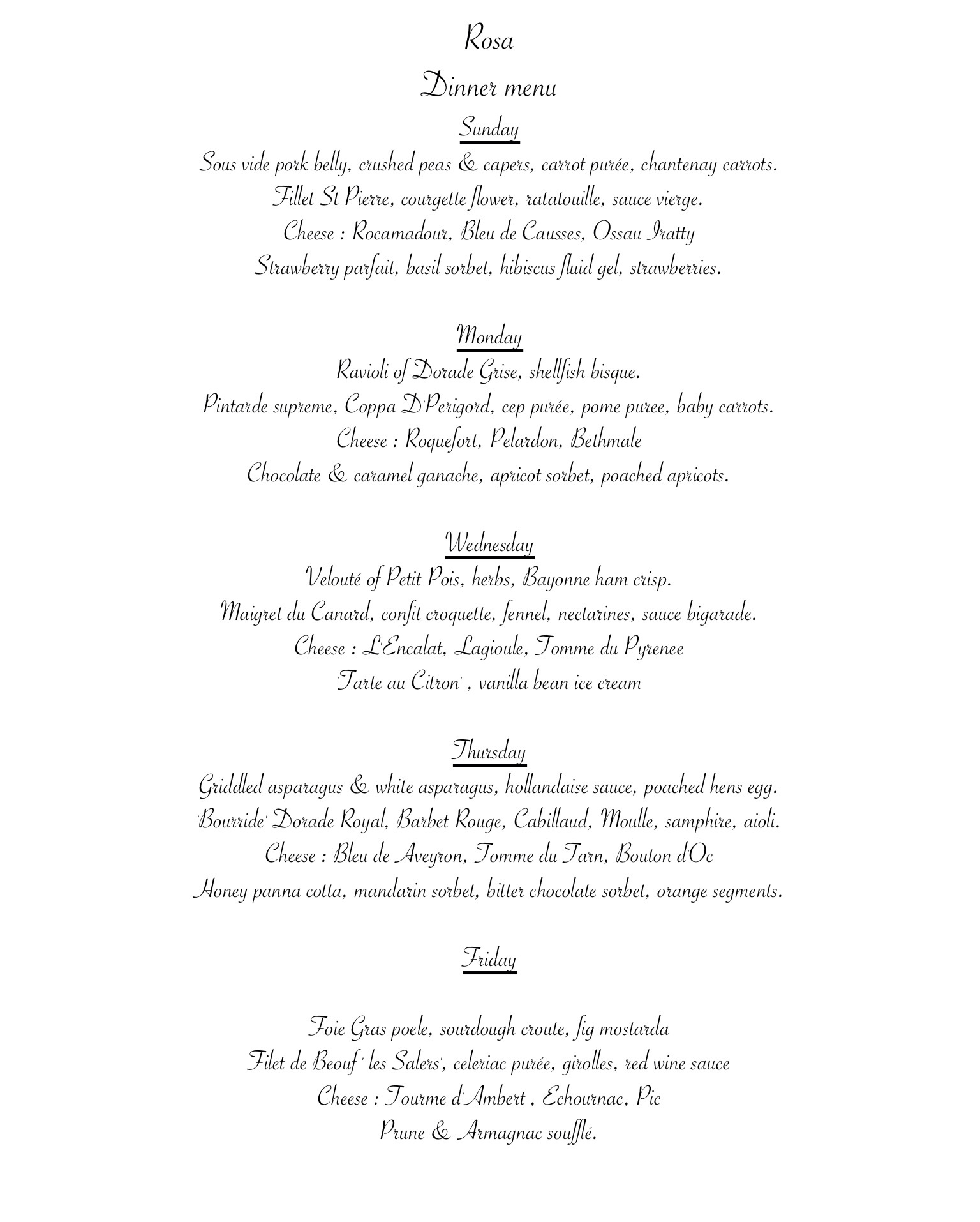 Rosa Dinner Menu Posted by Mike Crowson on June 1, 2014 Dinner menu from 25th to 31st May FacebookShareLike Loading... Related