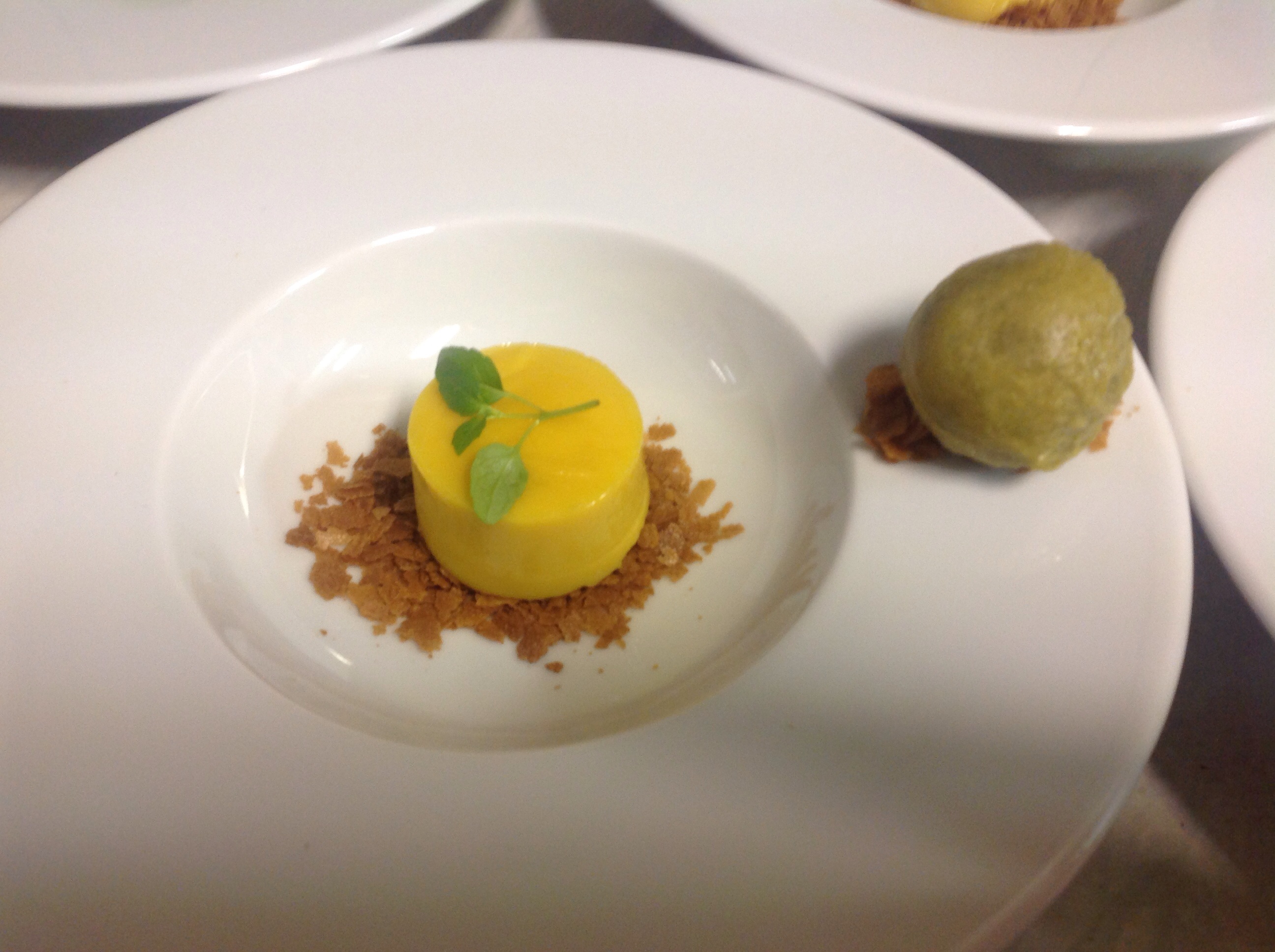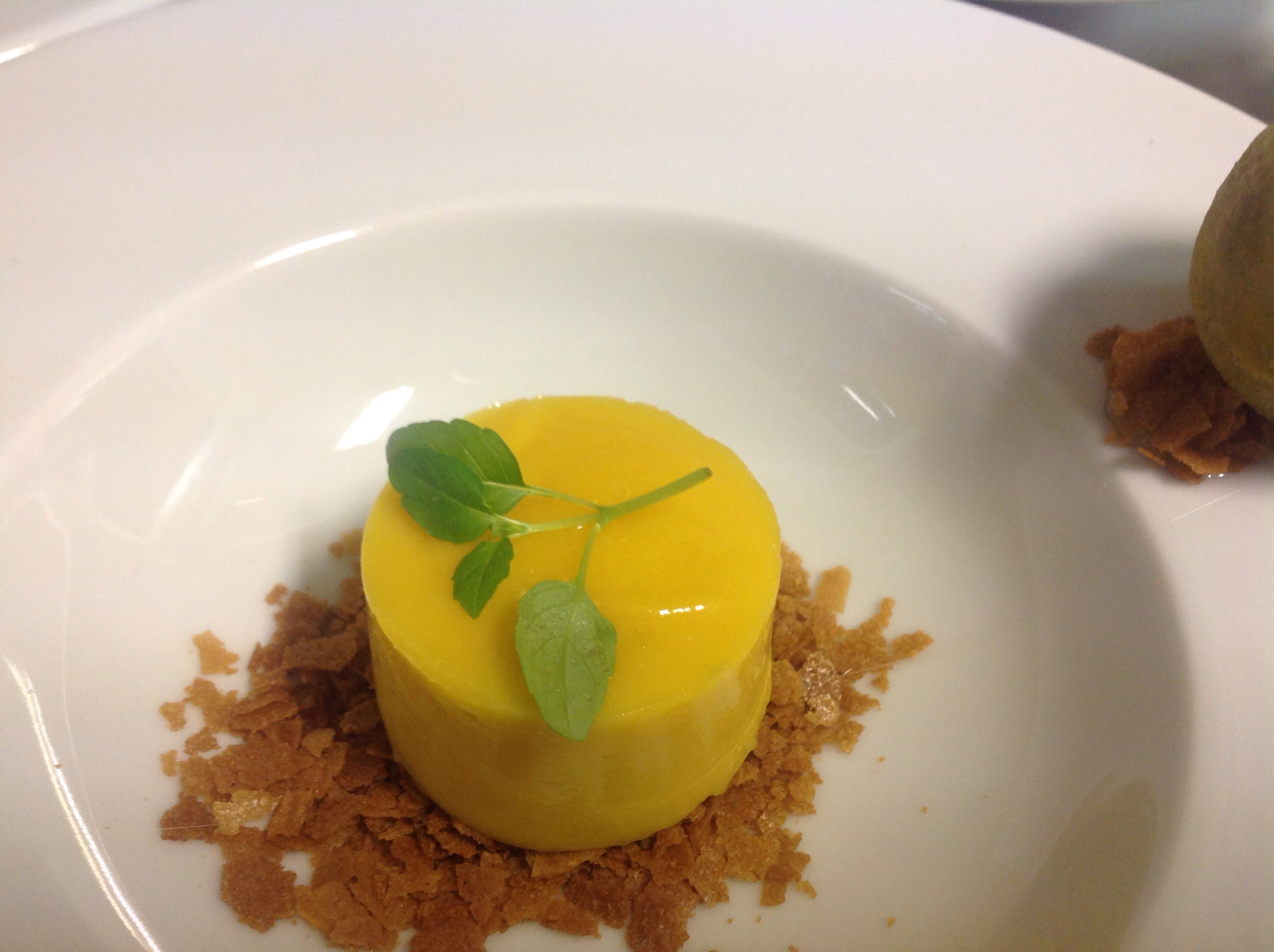 Set lemon cream is lemon purée cooked out in a thermomix with cream & eggs, then set in the fridge, served with Paillette Feuillettine which is broken up pieces of very crispy crepe biscuit with a caramel flavour, which represents the pastry & a fresh basil & lime sorbet.