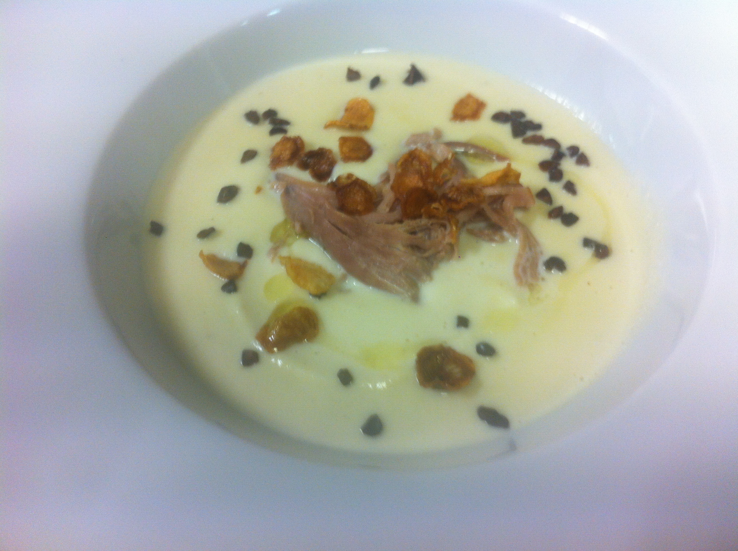 A veloute of Jerusalem artichoke ( sun choke ) with pulled confit duck leg, Jerusalem artichoke crisps, cacao nibs & white truffle oil.