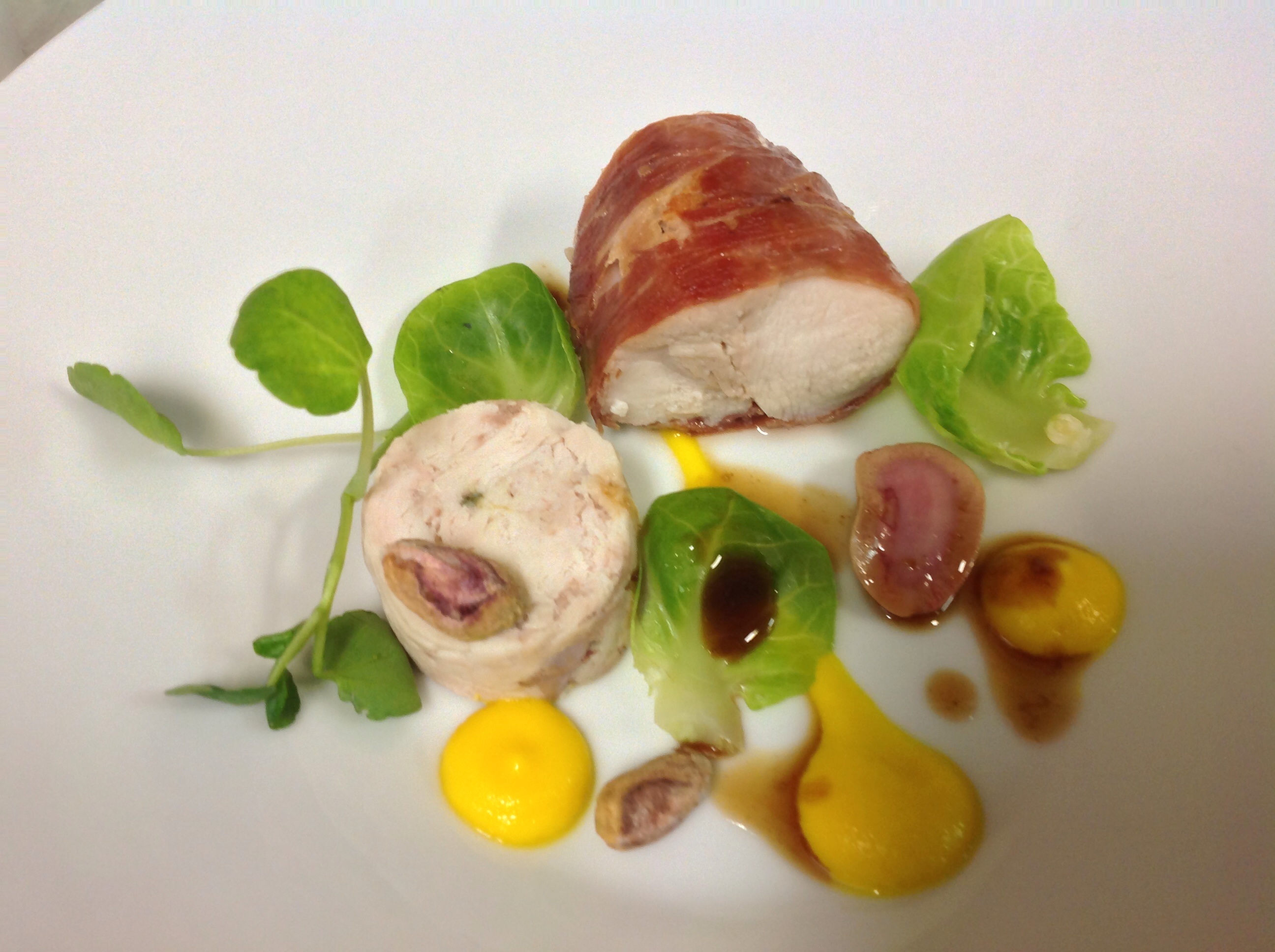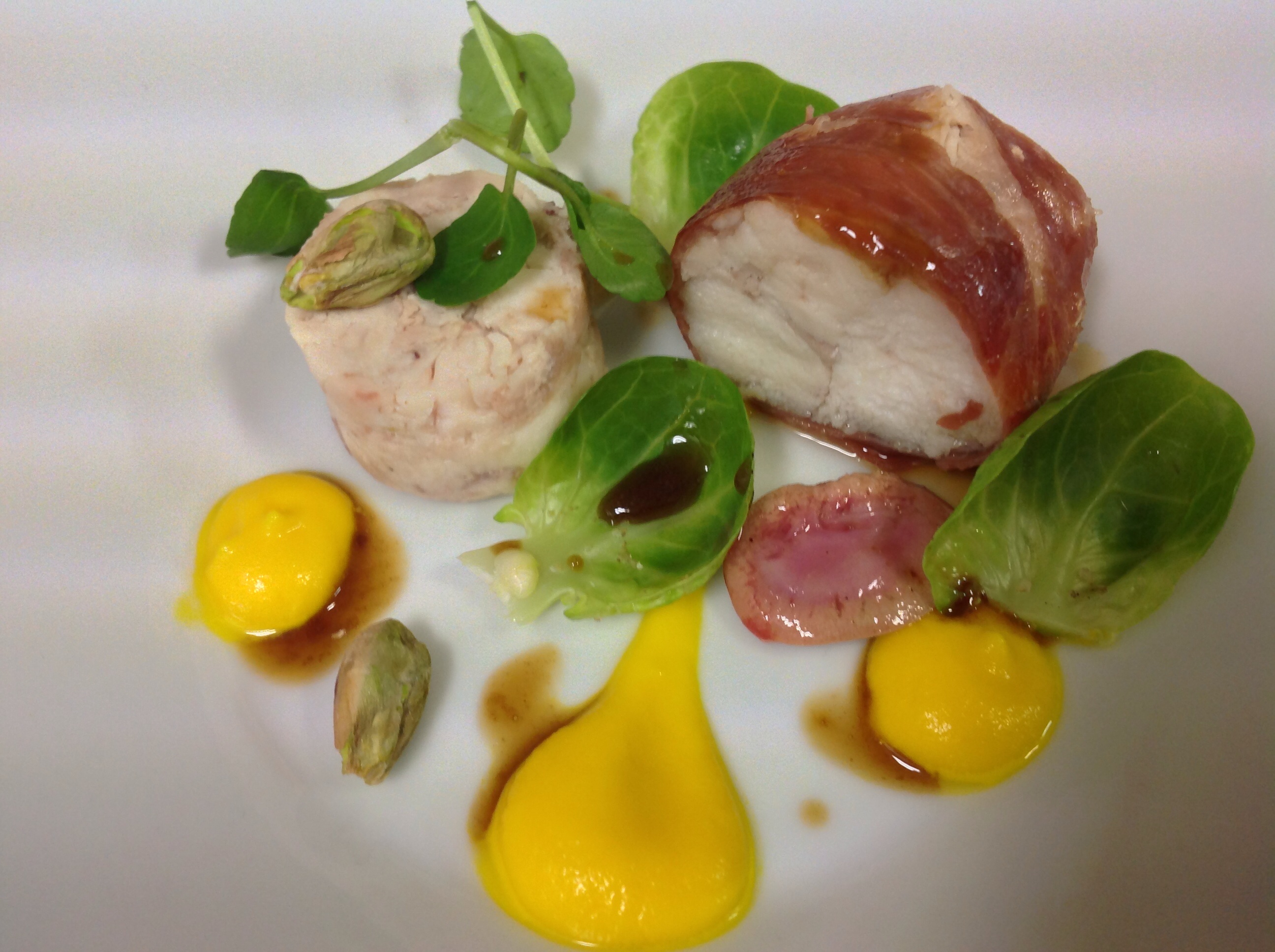 Rabbit saddle wrapped in Bayonne ham, terrine of confit rabbit leg & marjoram, seared rabbit kidney, carrot purée, pistachio, sprout leaves, Madeira.