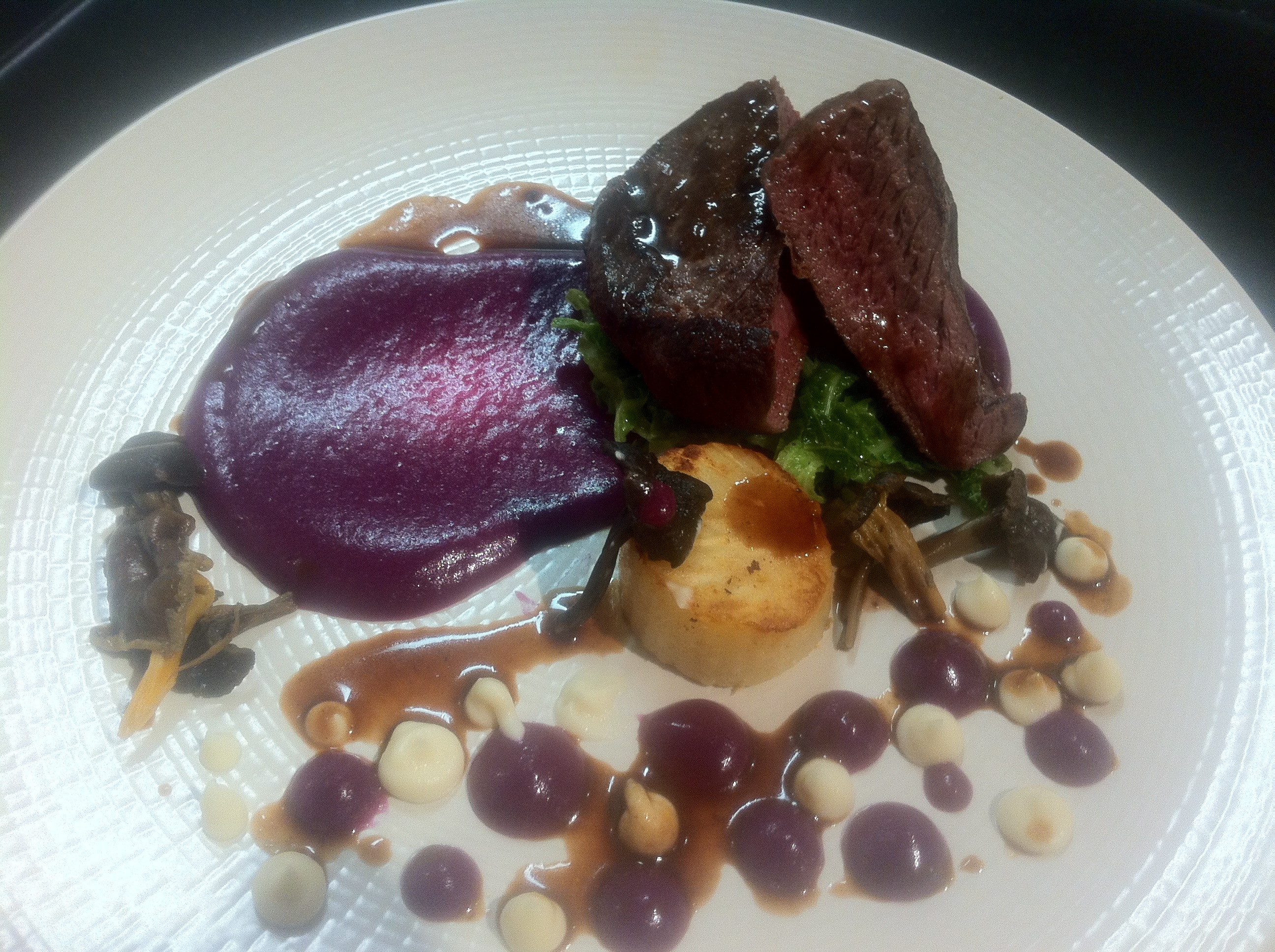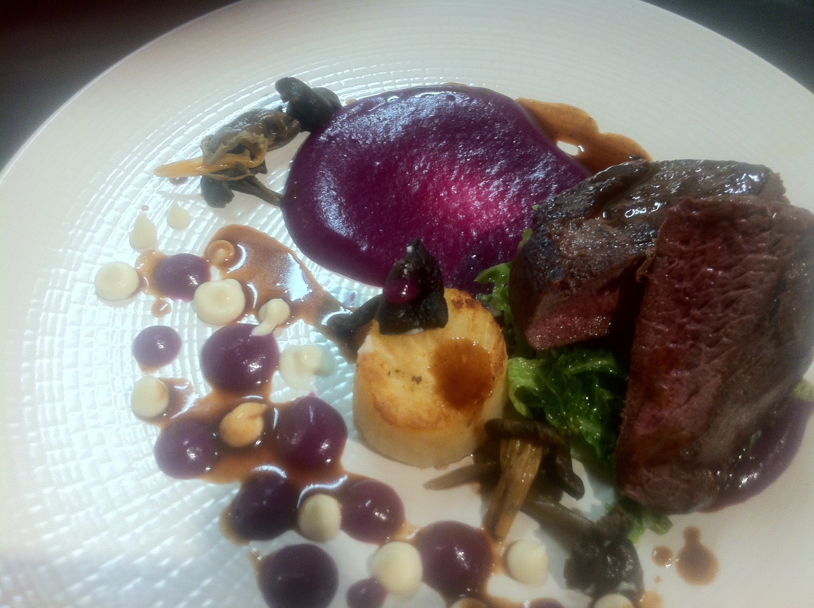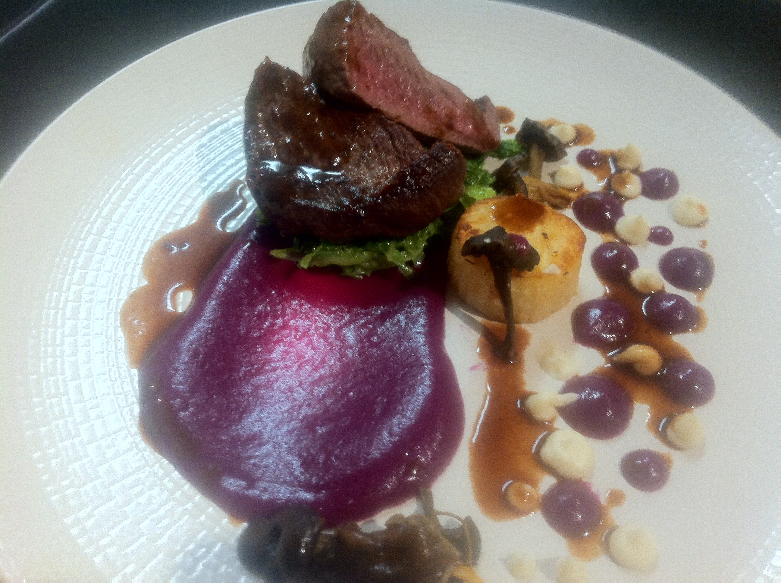 Loin of Venison served with red cabbage purée, celeriac fondant & celeriac purée, savoy cabbage, pickled yellow chanterelles & a chocolate & red currant sauce.