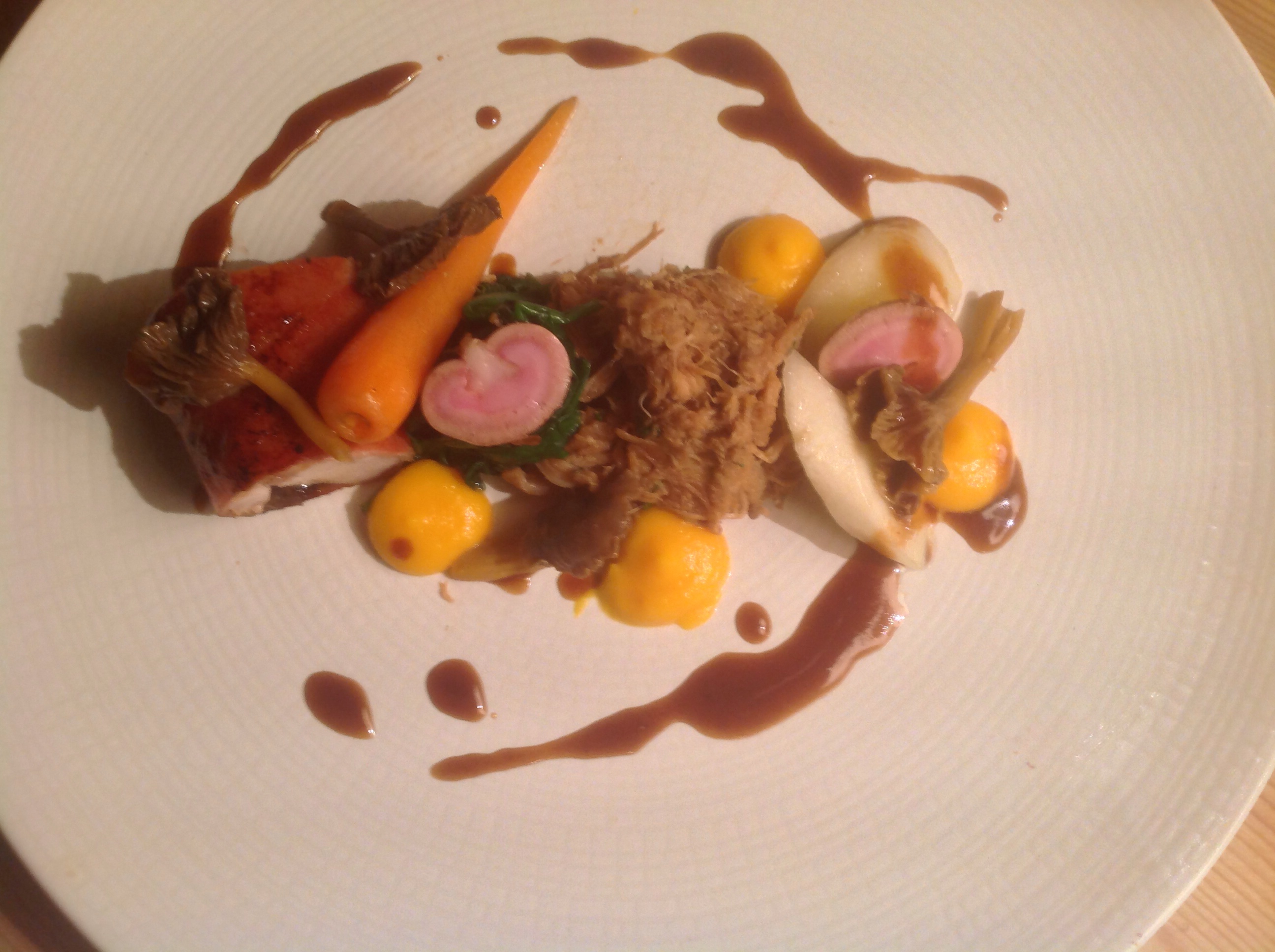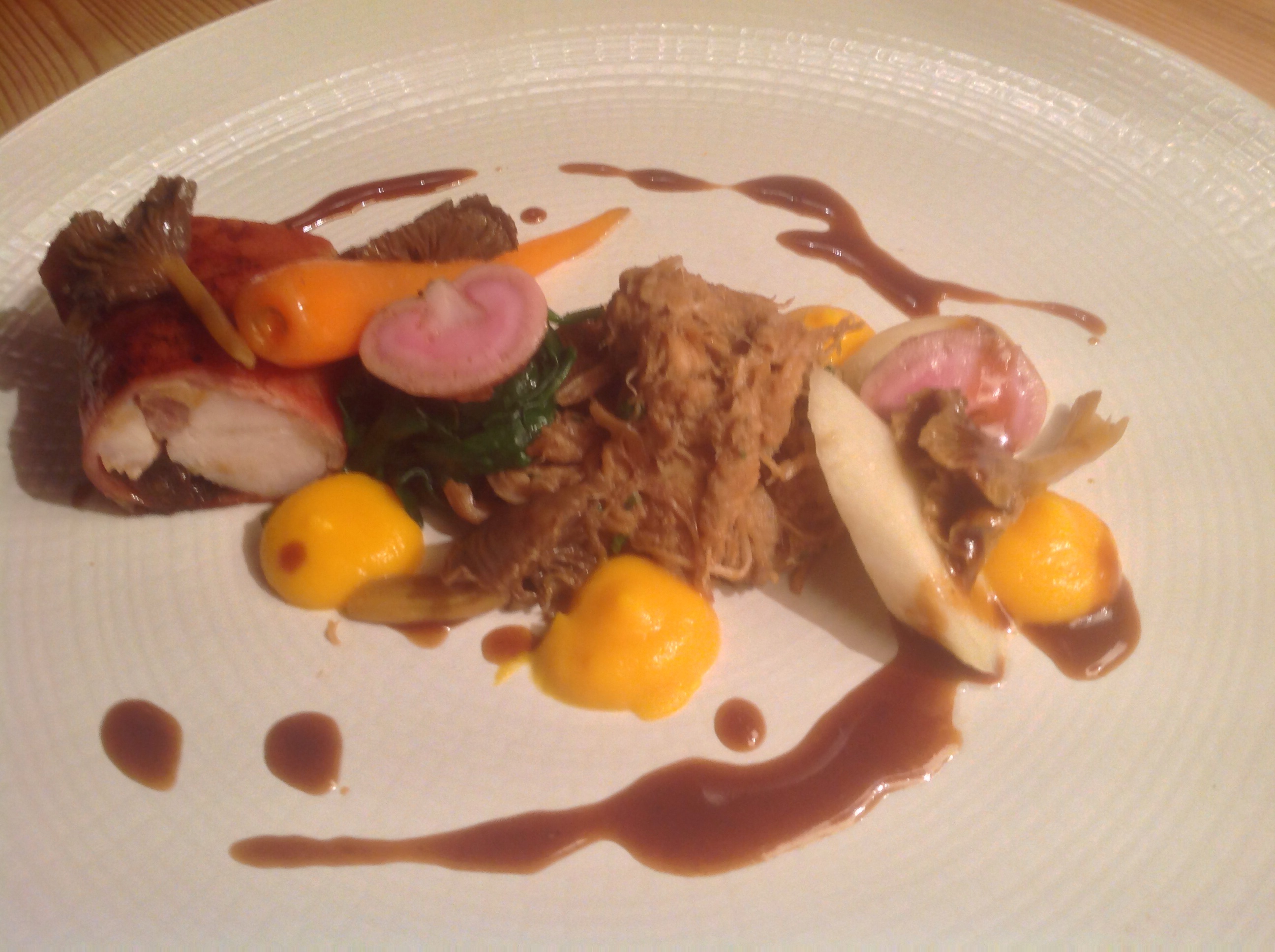 Loin of rabbit with prunes wrapped in Serrano ham, ragu of rabbit leg, rabbit kidneys, white carrot, baby carrot, carrot purée, pickled yellow chanterelles, spinach, madeira & marjoram sauce.