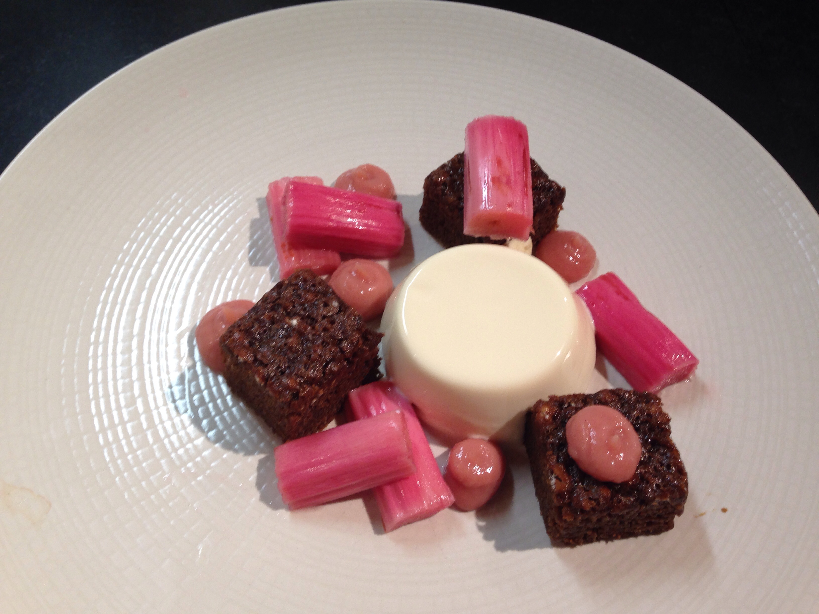 Honey panna cotta served with sticky gingerbread, rhubarb purée & sous vide cooked rhubarb.