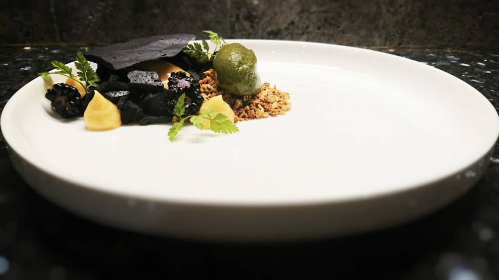 The dessert is made up of a lemon cream, not a curd which I found to claggy & sweet, biscotti crumb made with citrus & nuts, this is to represent the pastry element, black meringue which is dehydrated for a crisp texture but still melts on the palate, to balance the sweetness there is a basil & lime sorbet which also gives the dish a herby note, the dish is finished with fresh blackberries & chervil.