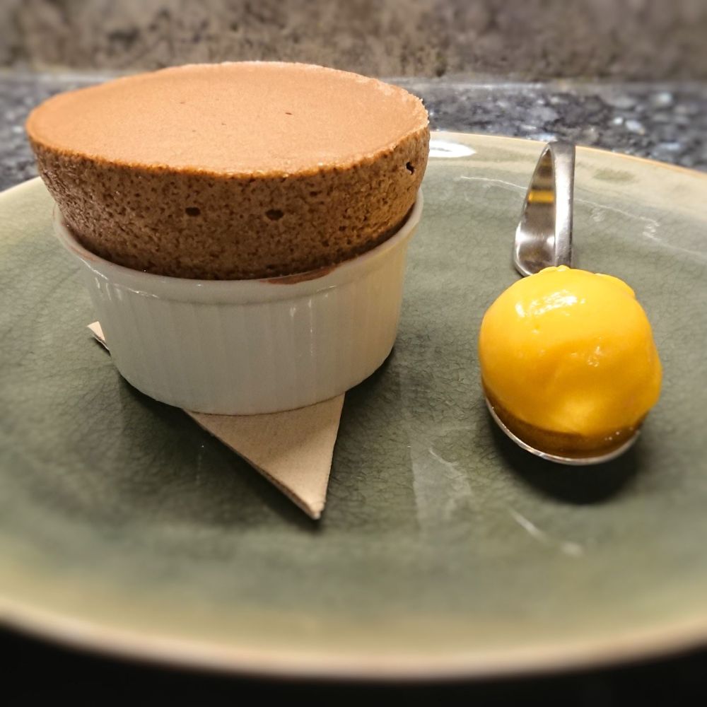 Here we have served the soufflé with a passion fruit sorbet to cut the richness of the chocolate.